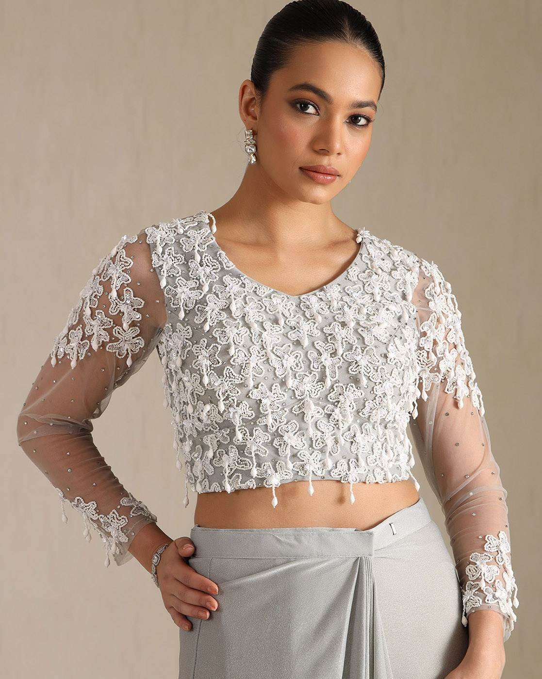- The last image gives a detailed look of the blouse piece that comes with this saree (The model is wearing a blouse from our in-house wardrobe)